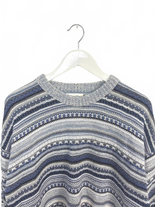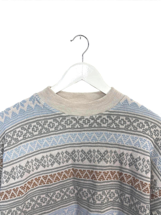 Vintage 90s Womens Blue Beige Brown Stripe Patterned Sweater Medium