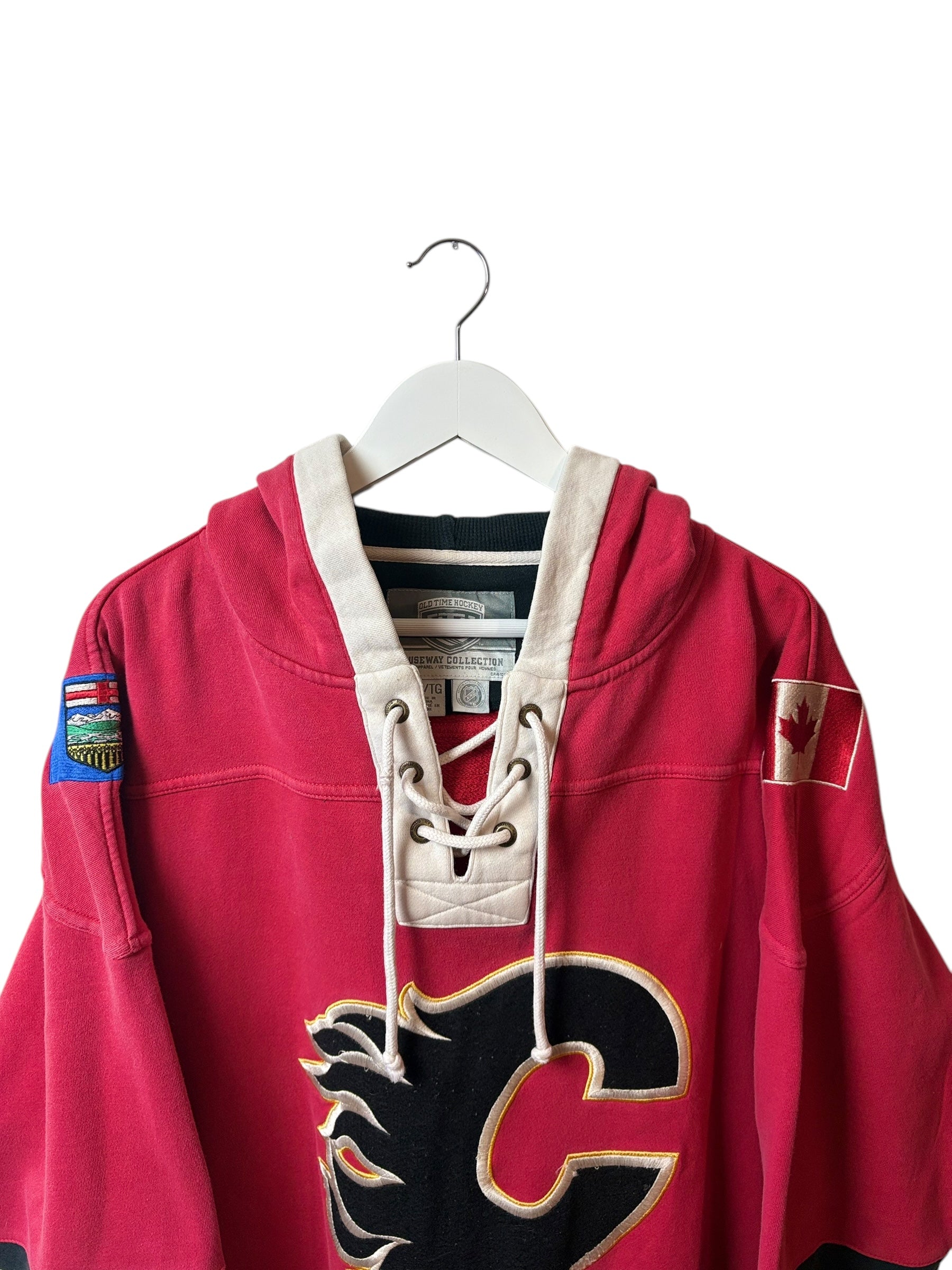 NHL Old Time Hockey hoodie with a Calgary Flames 'C' logo front graphic. Features a lace-up neckline, Canadian flag patch, and striped sleeves for a hockey jersey aesthetic. Soft, comfortable fit, perfect for casual wear.